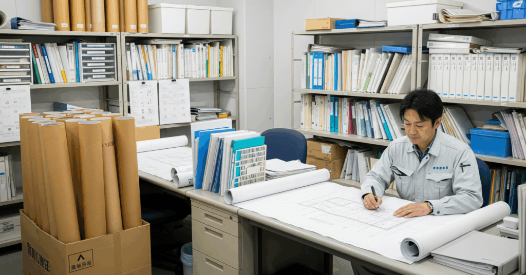 現場事務所を埋め尽くす図面の筒。雨の日の現場で濡れてしまい、インクが滲む紙図面。設計変更のたびに発生する、大量の印刷と古い図面の廃棄作業…。