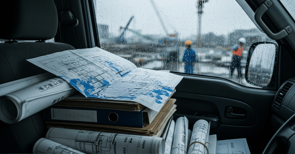 雨に濡れてにじむ図面。泥やホコリで汚れて見えにくくなる指示。山のような図面ファイルで、車の助手席や事務所の机はいつもパンパン。そして、現場で一番聞きたくない言葉…「あれ、この図面、最新版だっけ?」