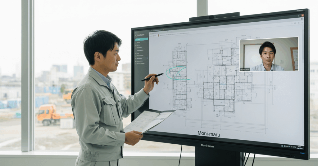 After モニまるを使ったWeb会議で、設計者と現場監督が図面を共有しながら変更点を確認。その場で朱入れした図面を全関係者に共有することで、伝達ミスがゼロになった。